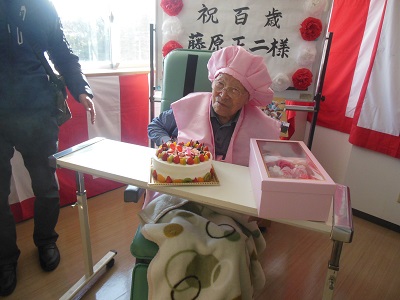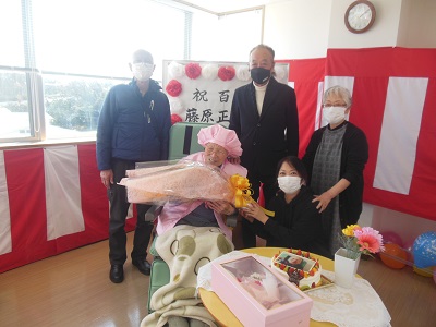 特別養護老人ホームしおかぜでは、コロナ禍で面会が困難な中、参加者を限定してご家族様に来て頂き、百歳のお祝いの会を行いました。